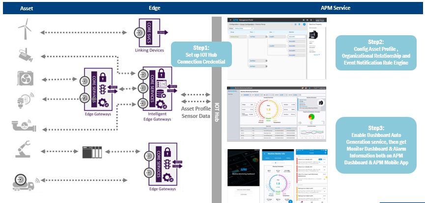 Khi dữ liệu được kết nối với WISE-PaaS Cloud, người dùng có thể trực tiếp kích hoạt APM để cung cấp nhiều microservice , bao gồm mẫu thiết bị, đánh giá tài sản, báo cáo, thông báo, sự kiện / cảnh báo, tích hợp Workflow/MES và API OTA, mà không cần phát triển bổ sung, giúp dễ dàng tạo ra nhiều Digital Twin Template cho nhu cầu giám sát và bảo trì tài sản cố định, tài sản di động, trường và tích hợp phân quyền.