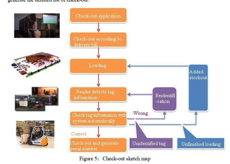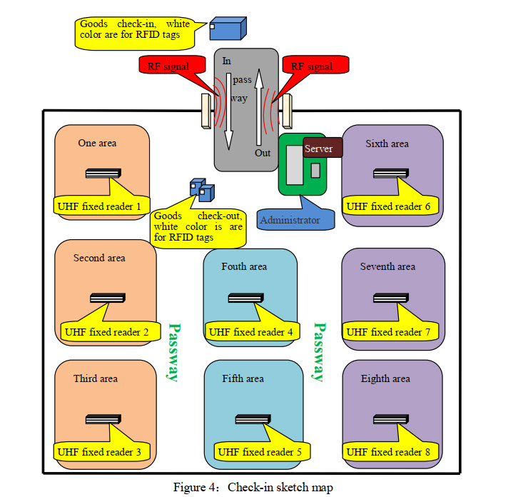 Hệ thống quản lý kho RFID bao gồm thẻ đăng ký, quản lý kiểm tra, quản lý đăng ký, phân bổ, lấy hàng và các chức năng bổ sung. Hệ thống quản lý kiểm tra bao gồm ứng dụng hàng hóa đi, nhận dạng hàng hóa đi, tải xuống hồ sơ đi. Hệ thống quản lý check-in chứa cài đặt phân phối vị trí, dỡ nhận dạng hàng hóa và quản lý hồ sơ check-in, check out.