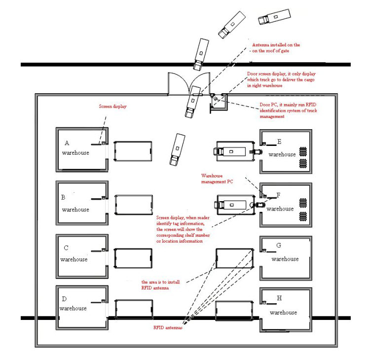 Đầu đọc cố định RFID được lắp đặt ở hai bên cổng thuận tiện để xác định việc nhận và trả hàng. Đầu đọc và màn hình hiển thị cố định RFID được lắp đặt tại cổng kho có thể phát hiện thông số kỹ thuật của hàng hóa bên trong.