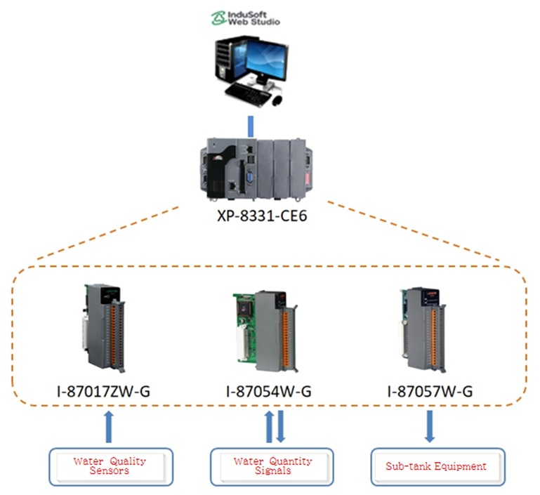 Một số module I/O ICP DAS đã được sử dụng để thu thập dữ liệu trong trường hợp này. Ví dụ, các mô-đun đầu vào tương tự I-87017ZW-G thu được tín hiệu 4 – 20 mA từ các cảm biến đo chất lượng nước. Ngoài ra, các mô-đun I/ O kỹ thuật số I-87054W-G được sử dụng để theo dõi tín hiệu nước tại chỗ và mô-đun đầu ra kỹ thuật số I-87057W-G được sử dụng để điều khiển thiết bị bể lắng phụ.