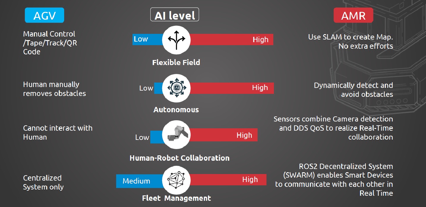 AMRs linh hoạt hơn nhiều. Nếu bố cục hoạt động thay đổi, bản địa hóa và lập bản đồ đồng thời (SLAM) cho phép robot khám phá không gian không xác định để tạo bản đồ tự động mà không cần thêm nỗ lực hoặc chi phí cho người vận hành. AMRs có thể sử dụng một loạt các công nghệ cảm biến để phát hiện và tránh chướng ngại vật một cách linh hoạt, bao gồm cả con người. Những robot này sử dụng cảm biến và kết hợp giữa phát hiện máy ảnh và công nghệ truyền thông thời gian thực, cho phép hợp tác theo thời gian thực với con người.