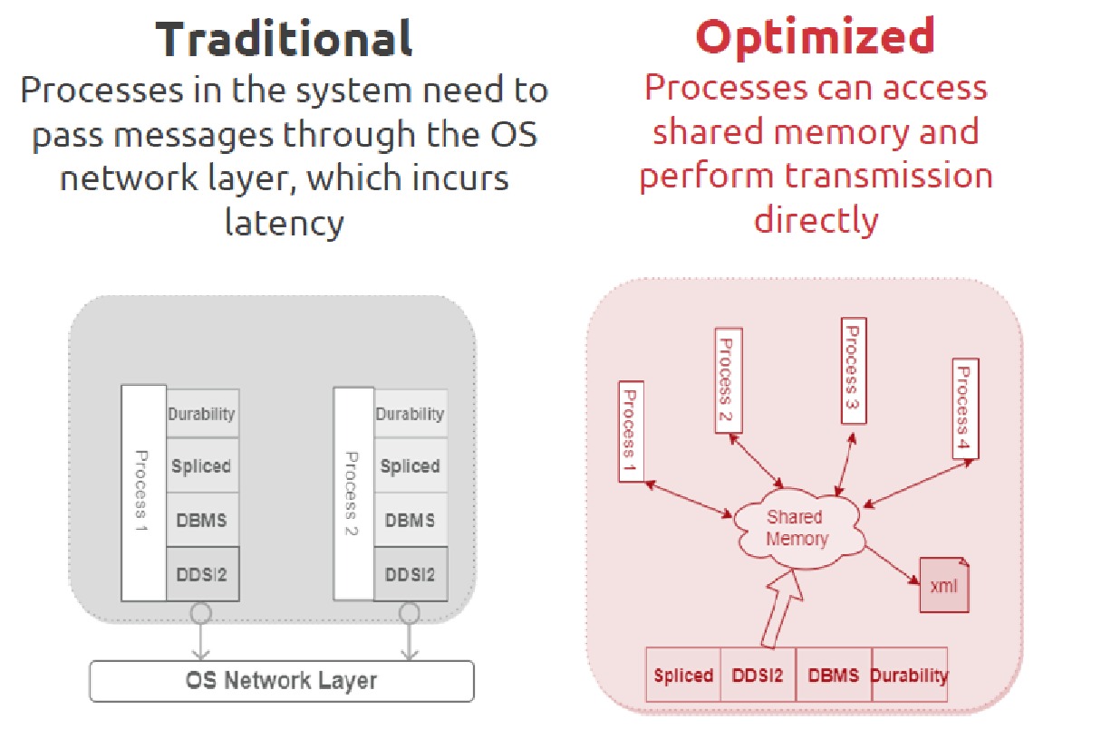 - Để tối ưu hóa việc xử lý dữ liệu nội bộ, hãy xem xét liệu hệ thống có cơ chế bộ nhớ được chia sẻ hay không ( xem hình 3). Trong các triển khai truyền thống, các quy trình trong hệ thống cần truyền tin nhắn qua lớp mạng hệ điều hành, phát sinh độ trễ. Truy cập bộ nhớ được chia sẻ và thực hiện truyền trực tiếp là một cách tiếp cận được tối ưu hóa và giảm độ trễ đáng kể.