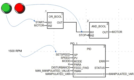 Muốn hiểu sâu về khái niệm này trước hết chúng ta đi vào phân tích cụm từ Supervisory Control. Lấy một ví dụ đơn giản là chúng ta muốn điều khiển tự động tốc độ động cơ duy trì ở tốc độ là 1500 vòng/phút. Như vậy, chúng ta sẽ dùng PLC để dùng vào mục đích này. Trong chương PLC chúng ta sẽ dùng khối điều khiển PID với tốc độ đặt (Set Speed) là 1500 vòng/phút. Ngoài ra PLC này được nối với một tủ điện trên đó có 2 nút nhấn Start/Stop động cơ (hình 1).