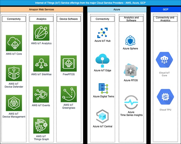 Bài viết này thảo luận chi tiết về các dịch vụ IoT được cung cấp bởi ba nhà cung cấp dịch vụ đám mây lớn – Amazon Web Services (AWS), Azure và Google Cloud Platform (GCP). Trong khi yếu tố trung tâm của các dịch vụ IoT là kết nối, nhập và xử lý, mỗi nhà cung cấp dịch vụ đám mây khác nhau cơ bản về cách đóng gói và định giá các dịch vụ. AWS dẫn đầu thị trường với các dịch vụ được quản lý tương đối nhiều hơn trong khi Azure và GCP theo sau.