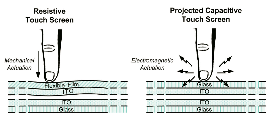 Màn hình cảm ứng PCAP sử dụng kính cường lực làm lớp bảo vệ bên ngoài trong khi màn hình cảm ứng điện trở sử dụng một lớp màng bảo vệ sẽ xuống cấp theo thời gian dài.