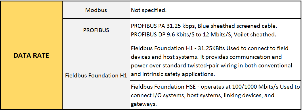 So sánh Modbus, Profibus và Foundation Fieldbus: Data rate