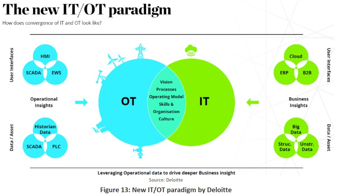 IT và OT trong lịch sử đã tạo nên các khía cạnh riêng biệt của các tổ chức hiện đại, một hiện tượng được gọi là sự hội tụ IT-OT đang thay đổi điều đó. Bởi vì công nghệ IoT đang sử dụng các tài sản thường không được kết nối với internet – chẳng hạn như máy móc dây chuyền lắp ráp – và đưa chúng trực tuyến, các doanh nghiệp hiện có cơ hội tạo ra hiệu quả mới bằng cách áp dụng trí thông minh của IT vào các tài sản vật lý của hệ thống OT.