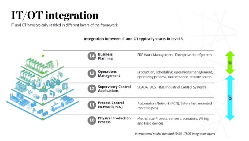 Sự hội tụ IT/ OT là sự tích hợp của các hệ thống sản xuất, vận hành kiểm soát các sự kiện và quy trình vật lý với phần cứng và phần mềm back-end để truyền tải và xử lý thông tin.