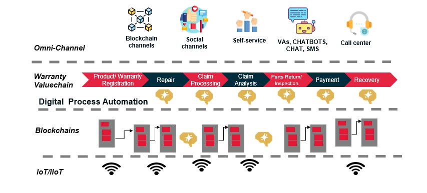 Quản lý bảo hành là một trong những chi phí quan trọng nhất đối với các công ty sản xuất. Mặc dù giảm số lượng đơn khiếu nại, nhưng vẫn có sự gia tăng đáng kể về chi phí trong chuỗi giá trị bảo hành. Các hệ thống di sản hiện có là khác nhau hoặc độc lập, đòi hỏi phải có sự bắt tay và can thiệp thủ công, với sự bất biến của hồ sơ. Trách nhiệm được chuyển cho khách hàng để chứng minh quyền sở hữu và bảo hành cho các OEM thông qua hóa đơn vật lý, góp phần làm giảm sự hài lòng của khách hàng, trùng lặp công việc và không có khả năng xử lý các khiếu nại giả mạo và gian lận. Sự kết hợp kép của Blockchain + DPA, nhằm mục tiêu nhắm đến những sự thiếu hiệu quả này bằng cách tối ưu hóa chuỗi giá trị bảo hành. Các tổ chức có được sức mạnh để theo dõi bộ phận với một bộ đôi kỹ thuật số cho toàn bộ vòng đời của chuỗi giá trị bảo hành, như được minh họa ở đây.