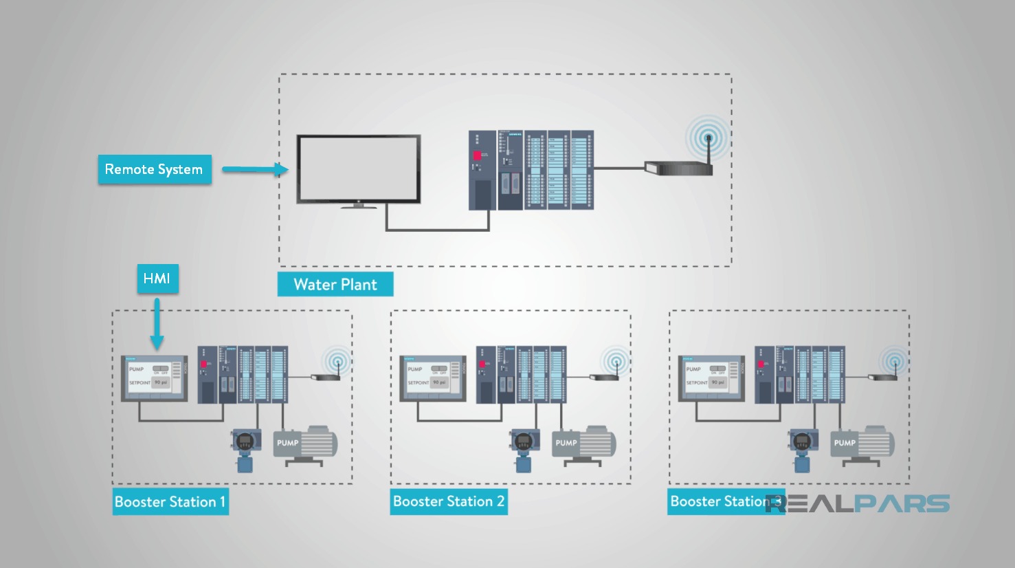 Ví dụ hệ thống máy bơm xử lý nước được đặt rải rác khắp thành phố. Chúng được kiểm soát và giám sát tại phòng điều khiển trung tâm ở nhà máy nước. HMI là giao diện để con người giám sát và điều khiển máy.