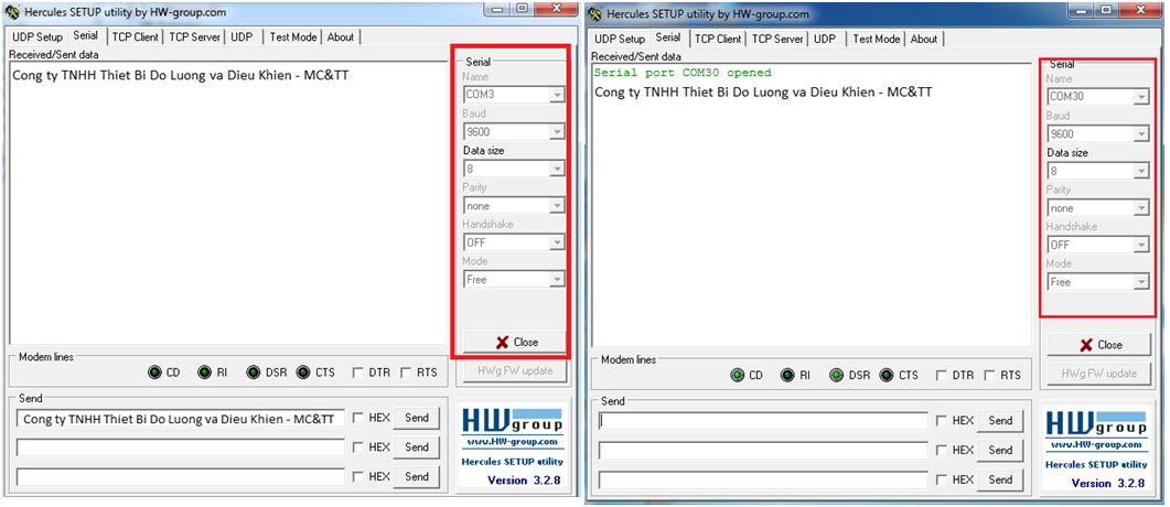 Và đây là kết quả: ta đã truyền được 1 chuỗi ký tự “ Cong ty TNHH Thiet bi Do Luong va Dieu Khien – MC&TT” qua cổng COM ảo (COM 30).