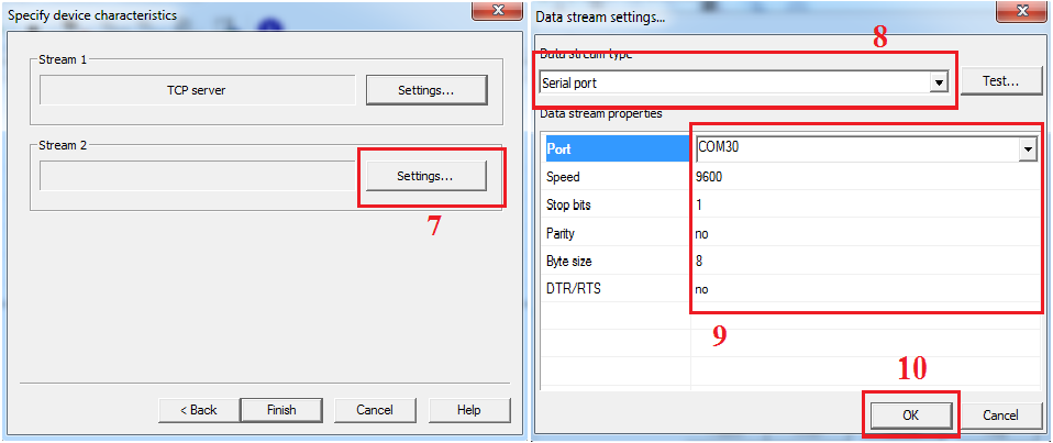 Tại mỗi tab ở mục Serial chọn: Mở cổng COM vật lý (COM 3) và COM ảo (COM 30), điền Baud, Data size, Parity theo đúng thông số ta đã thiết lập.