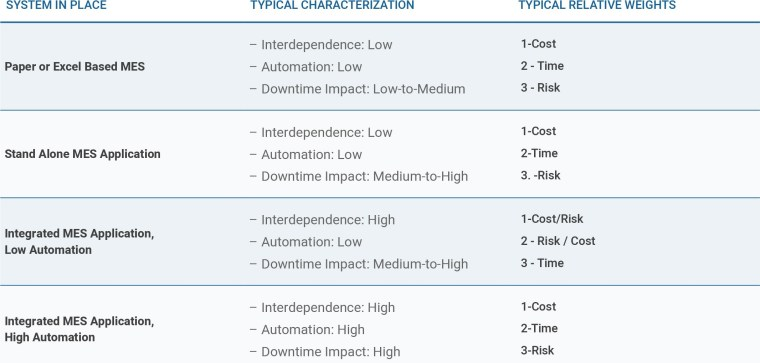 Các yếu tố này phải được cân nhắc và phân tích so với các lựa chọn thay thế chiến lược Thay đổi hệ thống có thể có. Trọng số phụ thuộc vào sự phụ thuộc lẫn nhau của các ứng dụng (có bao nhiêu giao diện giữa các ứng dụng và các hệ thống khác); mức độ tự động hóa mà hệ thống MES chịu trách nhiệm và cuối cùng là tác động của downtime mà doanh nghiệp phải trả cho mỗi đơn vị thời gian mà hệ thống MES không khả dụng. Điều này được phản ánh trong bảng dưới đây.