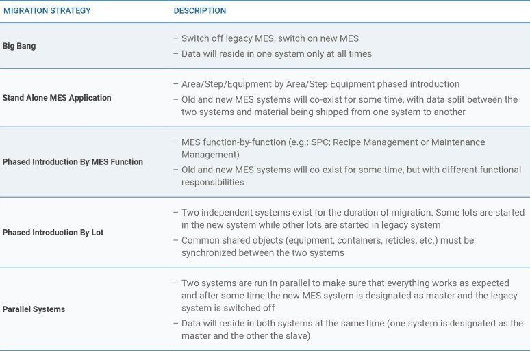 - Hệ thống song song. hệ thống MES Cũ và Mới được sử dụng song song với nhau cho đến khi đủ độ tin cậy và khả năng được xây dựng trong hệ thống MES Mới để hệ thống MES Cũ có thể được tháo bỏ.