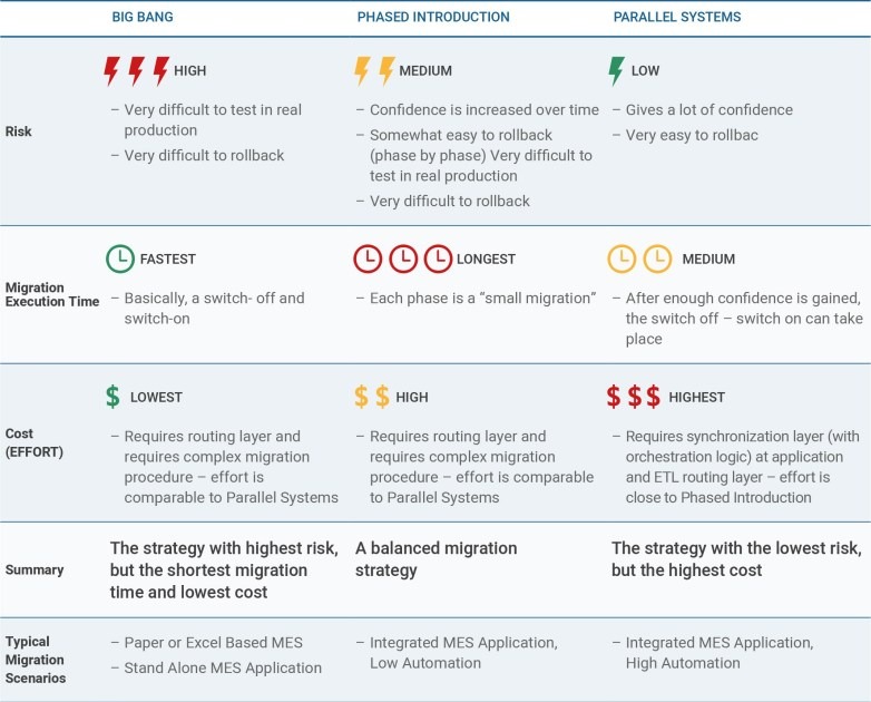 Tuy nhiên, vì hệ thống MES quản lý các hoạt động tạo ra doanh thu, nên có rủi ro liên quan đến việc di chuyển dữ liệu và quy trình từ một hệ thống cũ sang một hệ thống MES mới. Điều quan trọng đối với sự thành công của quá trình di chuyển là khiến tất cả các bộ phận bị ảnh hưởng cam kết và tham gia. Điều đó bắt đầu với việc tạo ra một chiến lược phù hợp với đặc tính của tổ chức.