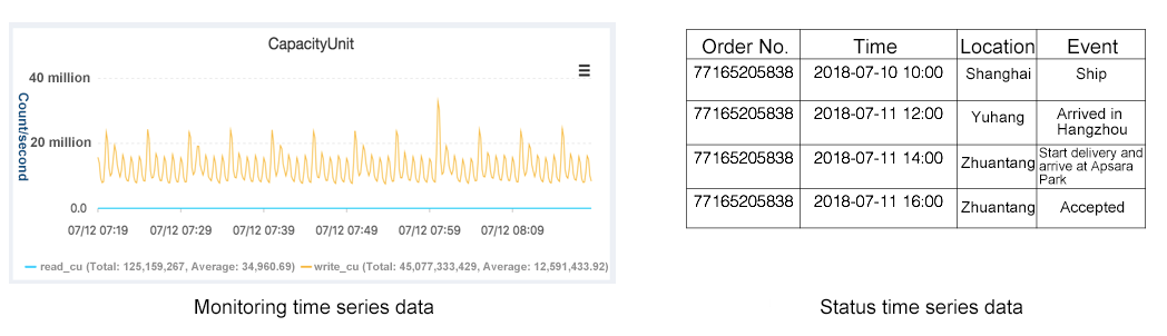 Các ứng dụng này dựa trên một dạng dữ liệu đo lường cách mọi thứ thay đổi theo thời gian. Bộ dữ liệu chuỗi thời gian theo dõi các thay đổi đối với toàn bộ hệ thống dưới dạng INSERT, không phải CẬP NHẬT. Mỗi nguồn dữ liệu định kỳ gửi các bài đọc mới để tạo kết quả đo được thu thập theo thời gian. Những kết quả đo lường là dữ liệu chuỗi thời gian. Tập dữ liệu chuỗi thời gian chủ yếu có ba đặc điểm sau: