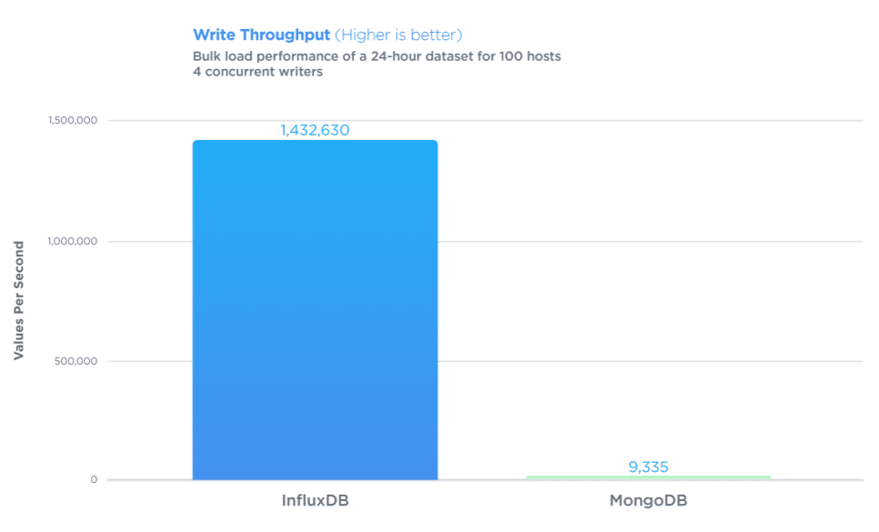 Ngược lại, cơ sở dữ liệu chuỗi thời gian (có thể dựa trên cơ sở dữ liệu quan hệ hoặc cơ sở dữ liệu NoQuery) xử lý quy mô hiệu quả chỉ có thể có khi bạn coi thời gian là ưu tiên nhất. Những hiệu quả này dẫn đến cải thiện hiệu suất, bao gồm tốc độ nhập cao hơn, truy vấn nhanh hơn theo tỷ lệ (mặc dù một số hỗ trợ nhiều truy vấn hơn các truy vấn khác) và nén dữ liệu tốt hơn.