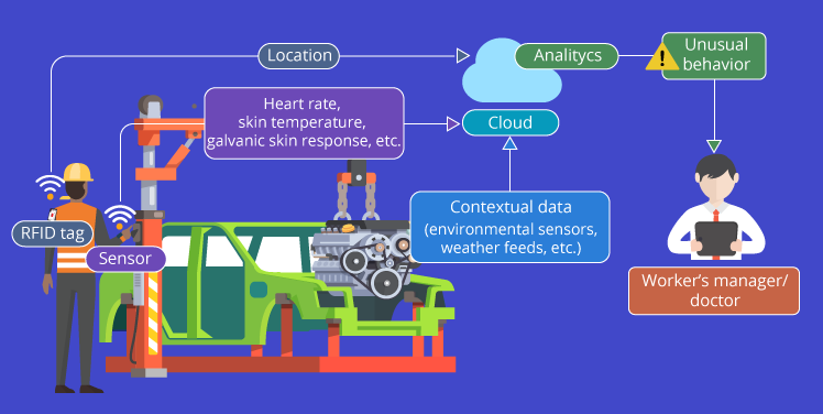 Trong các lĩnh vực công nghiệp khác nhau, bao gồm khai thác, dầu khí, vận tải, v.v., công nhân nhận được thẻ RFID thu thập dữ liệu về vị trí của họ và cảm biến đeo được thu thập dữ liệu về nhịp tim, nhiệt độ da, phản ứng ngoài da và các thông số khác. Dữ liệu cảm biến được chuyển đến đám mây nơi nó được phân tích dựa trên dữ liệu theo ngữ cảnh (ví dụ từ cảm biến môi trường, hệ thống lập kế hoạch công việc cũ, thức ăn thời tiết, v.v.) để phát hiện các kiểu hành vi bất thường (giả sử, chuyển động thẳng đứng đột ngột, nhịp tim bất thường, v.v. ) và ngăn chặn công nhân té ngã, quá sức và các thương tích khác và báo cáo kịp thời mối đe dọa an toàn.