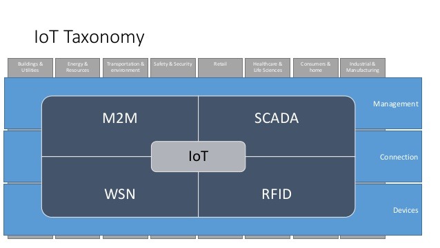 Bốn trụ cột của IoT là M2M, RFID, WSNs và SCADA. Bốn trụ cột khép kín này sẽ được bổ sung vào các thời điểm khác nhau, với sự ra đời của IoT, tất cả các hệ thống kín đáo này sẽ được tích hợp để cung cấp một chuỗi giá trị mở rộng cũng như nâng cao cho toàn doanh nghiệp.