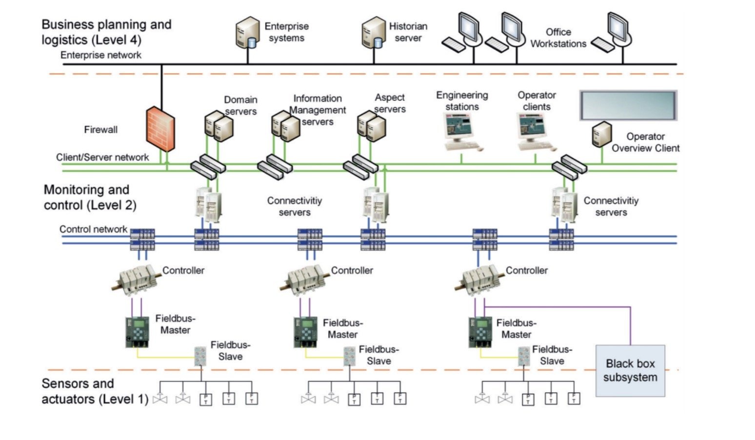 - Bộ điều khiển logic có thể lập trình (PLC) và Thiết bị đầu cuối từ xa (RTU): Đây là các thành phần phần cứng giao tiếp với máy và điều khiển chúng. Chúng chịu trách nhiệm giao tiếp với các cảm biến trong máy. Tất cả các thông số yêu cầu giám sát đều có ở đây. PLC và RTU là (các) intergace chính trong tổ chức với thế giới máy móc.
