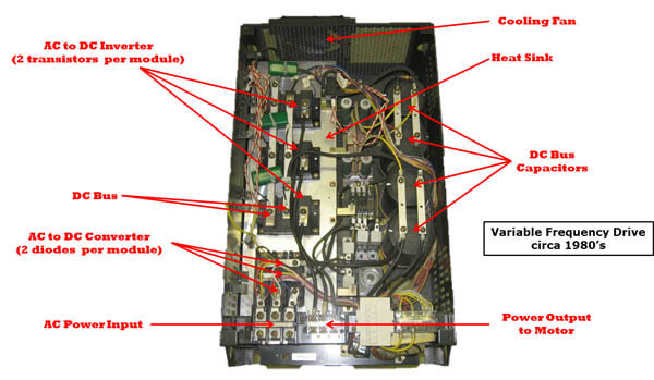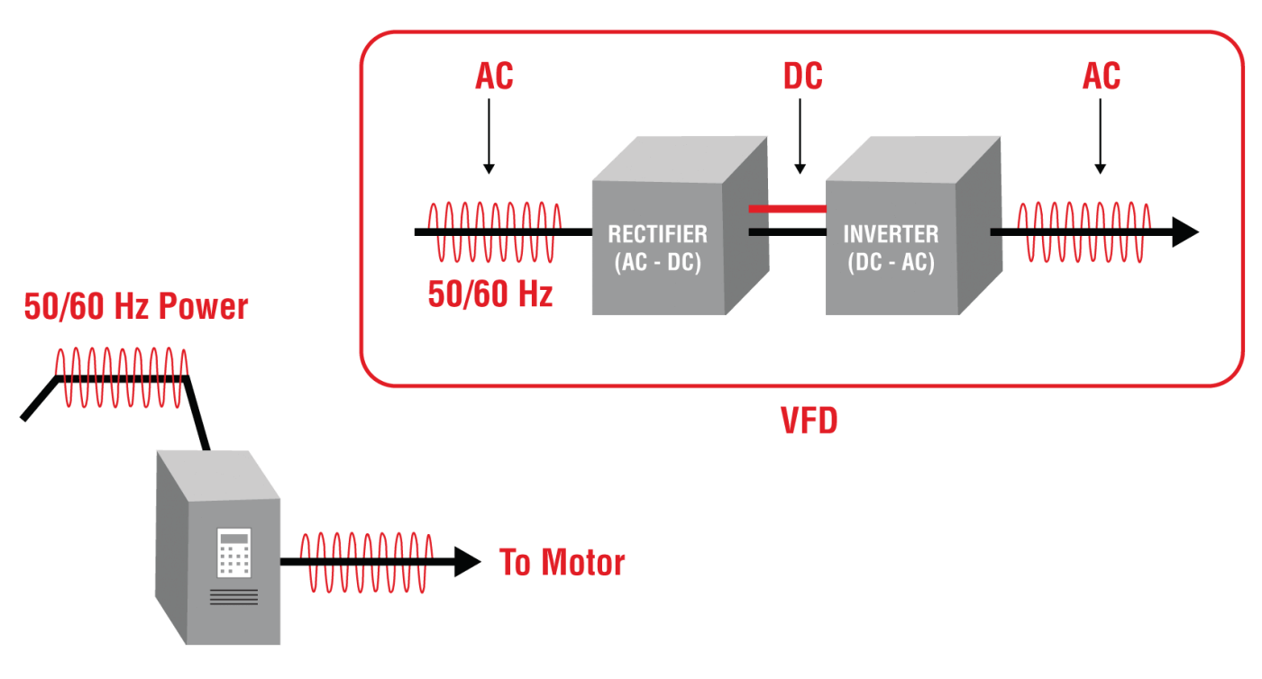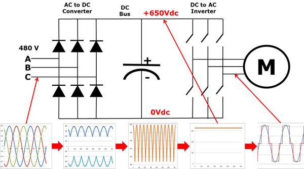 Lưu ý rằng đầu ra từ VFD là dạng sóng “hình chữ nhật”. VFD không tạo ra đầu ra hình sin. Dạng sóng hình chữ nhật này sẽ không phải là lựa chọn tốt cho các hệ thống điều khiển chung, nhưng hoàn toàn phù hợp cho động cơ.