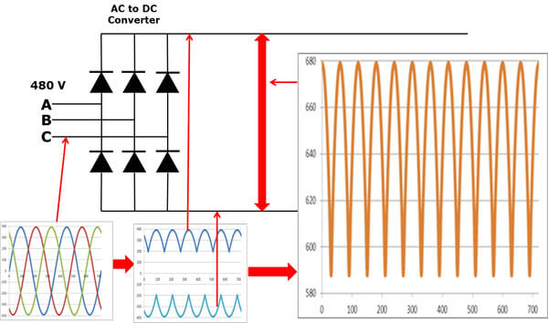 Giả sử rằng biến tần đang hoạt động trên hệ thống điện 480V. Định mức 480V là “rms” (root mean squared). Các cực đại trên hệ thống 480V là 679V. Như bạn có thể thấy, bus VFD có điện áp một chiều với gợn sóng xoay chiều. Điện áp chạy trong khoảng từ 580V đến 680V.
