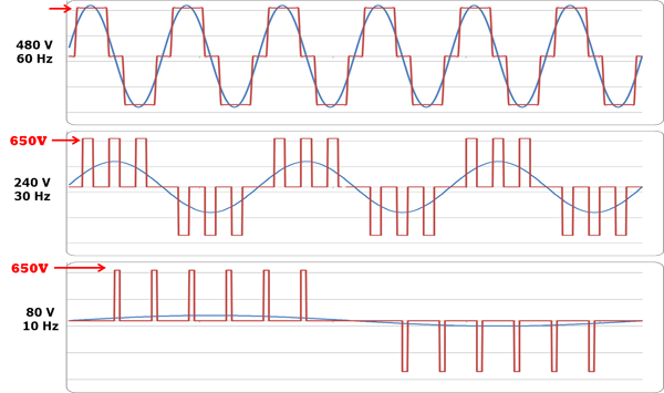 Đây được gọi là điều chế độ rộng xung (PWM). Hãy tưởng tượng rằng chúng ta có thể kiểm soát áp suất trong đường nước bằng cách bật và tắt van ở tốc độ cao. Mặc dù điều này sẽ không thực tế cho các hệ thống ống nước, tuy nhiên nó rất khả thi với VFD. Chú ý rằng trong nửa chu kỳ đầu tiên, điện áp BẬT một nửa thời gian và TẮT một nửa thời gian. Như vậy, điện áp trung bình là một nửa của 480V hoặc 240V. Bằng cách tạo xung đầu ra, chúng ta có thể đạt được bất kỳ điện áp trung bình nào trên đầu ra của VFD.