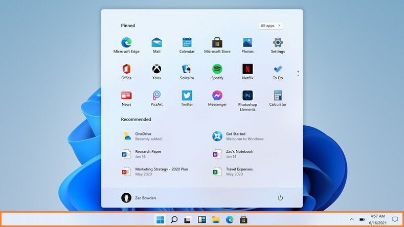 Menu Start có thiết kế bo tròn các góc và được đặt chính giữa màn hình. Các icon nằm rải rác trên cửa sổ hiển thị thay vì gom lại bên trái như trước. Phía trên cùng sẽ có thêm ô tìm kiếm để người dùng thuận tiện tìm kiếm ứng dụng.