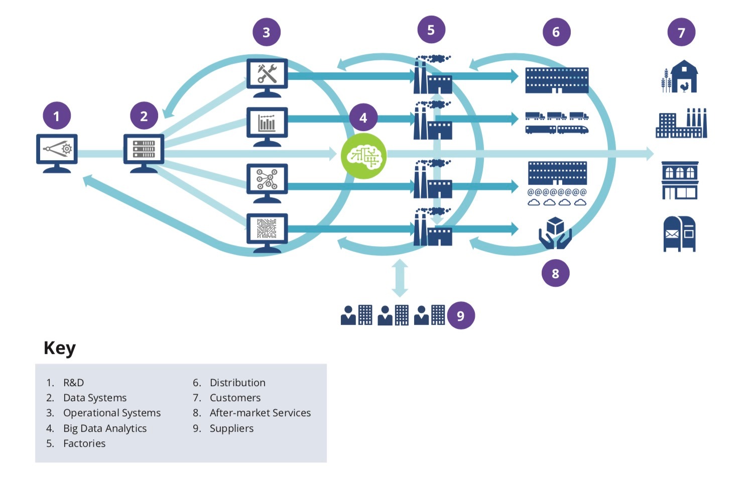 Yếu tố thành công quan trọng đối với Chuỗi giá trị nhà máy kỹ thuật số (Digital Factory Value Chain) là sự tích hợp các thành phần phức tạp của quy trình sản xuất nội bộ, nhà cung cấp, phân phối và dịch vụ hậu mãi. Như được mô tả bởi các mũi tên màu xanh lam trong hình trên, kết nối và các vòng phản hồi liên tục gắn kết với nhau từ các quy trình và hoạt động từ thượng nguồn đến hạ nguồn, các nhà cung cấp đến và đi từ hoạt động nhà máy của nhà sản xuất và các nhà sản xuất đến và từ khách hàng của họ.