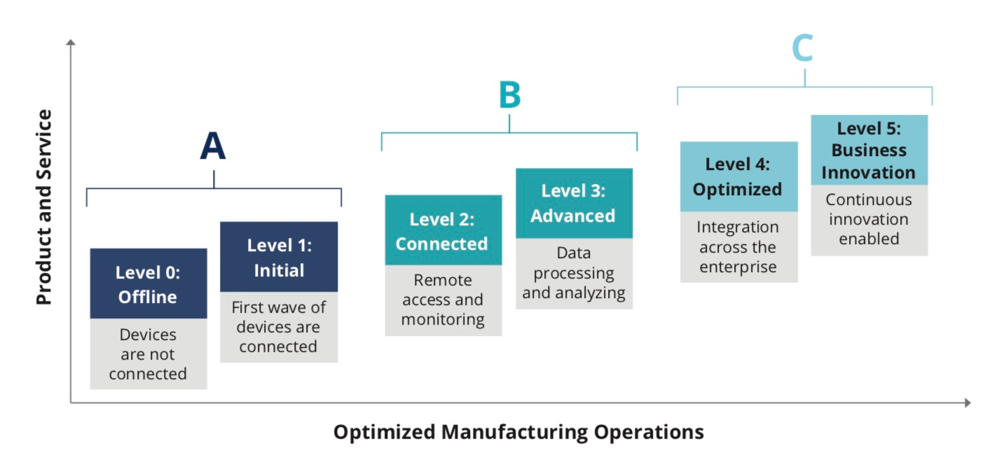 Hình dưới đây mô tả sáu cấp độ sẵn sàng và trưởng thành của doanh nghiệp. Ngày nay, phần lớn thị trường sản xuất nằm ở ba cấp độ đầu tiên, Cấp độ 0-2. Thị trường đang chứng kiến sự tăng trưởng ở Cấp độ 3, nơi kết nối IoT / IoT, phân tích thời gian thực và phân phối giá trị đang bắt đầu đạt được lợi nhuận dự kiến.